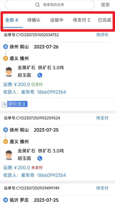 3、在运单管理页可查看全部订单状态,分类显示待确认、运输中、待支付、已完成等标签。
