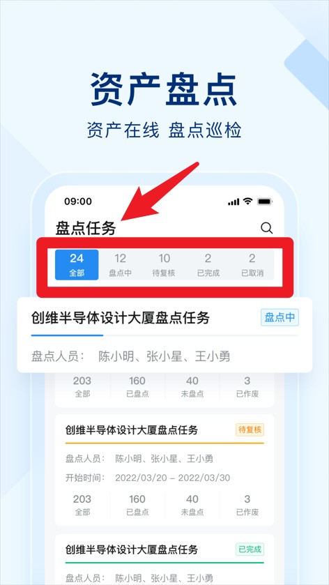 1、资产盘点功能支持查看盘点任务数量和状态,实时掌握资产执行情况,高效完成巡检流程。
