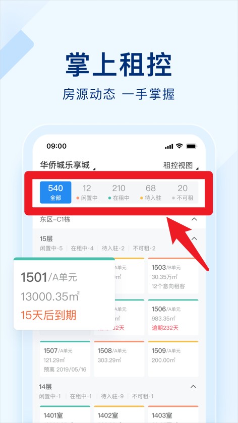 2、掌上租控展示房源状态分布情况,便于快速筛查可租单元,实现房源动态智能管理。