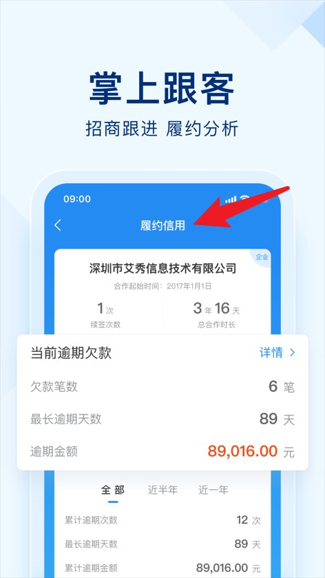 3、掌上跟客功能展示租户履约信用信息,包括欠款笔数与金额,助力判断与风险把控。