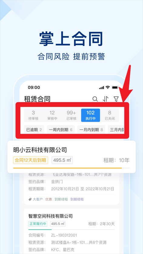 4、掌上合同支持合同周期状态分类查看,提前预警即将到期合同,降低合同风险。