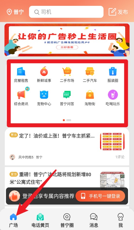 1、首页“广场”频道整合房屋租售、二手市场、新鲜城事等多种便民服务入口,分类清晰功能齐全。