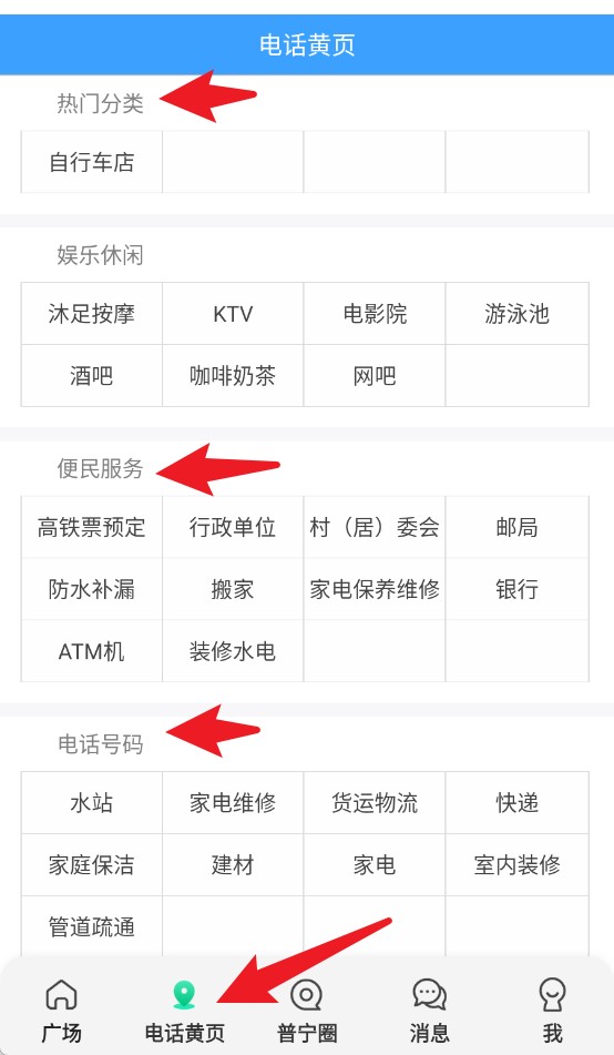 2、“电话黄页”模块涵盖娱乐休闲、便民服务等热门分类,查找本地生活信息快速便捷。