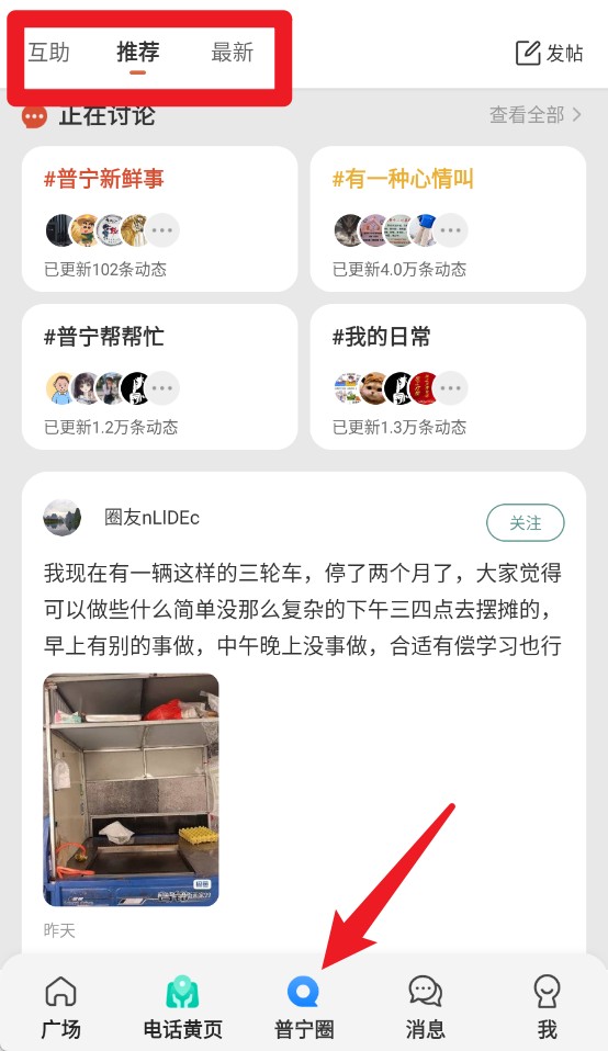 3、“普宁圈”提供互助、推荐、最新话题三大板块,用户可浏览动态或发布内容进行本地交流。
