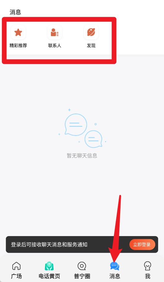 4、“消息”页面包含精彩推荐、联系人、发现三项功能,集中管理社交互动与系统通知信息。