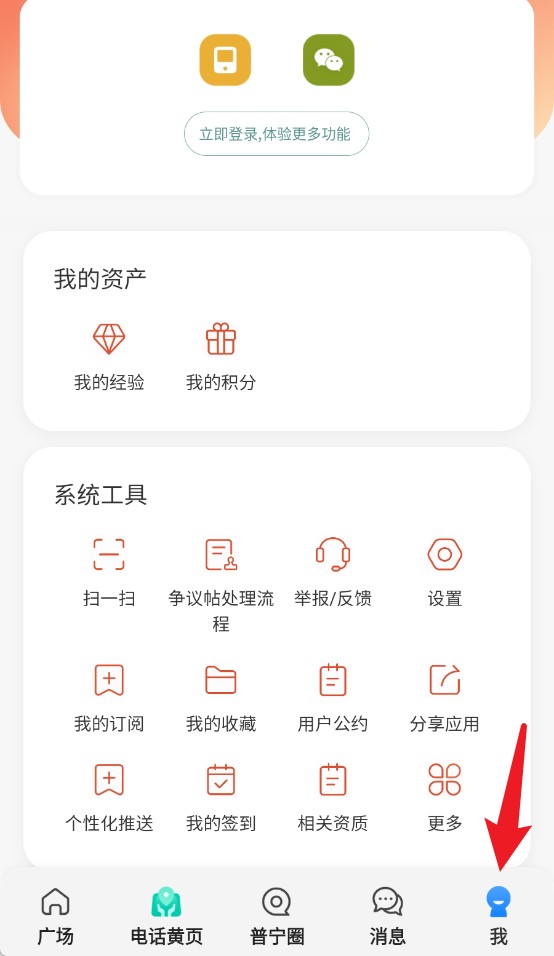 5、“我”的页面展示用户经验积分及系统工具,支持扫码、设置、收藏、签到等个性化操作。