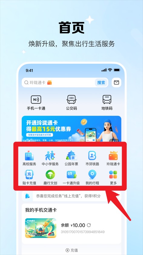 1、首页界面展示多种生活服务入口,涵盖公交、充值、门票等便民功能一应俱全。