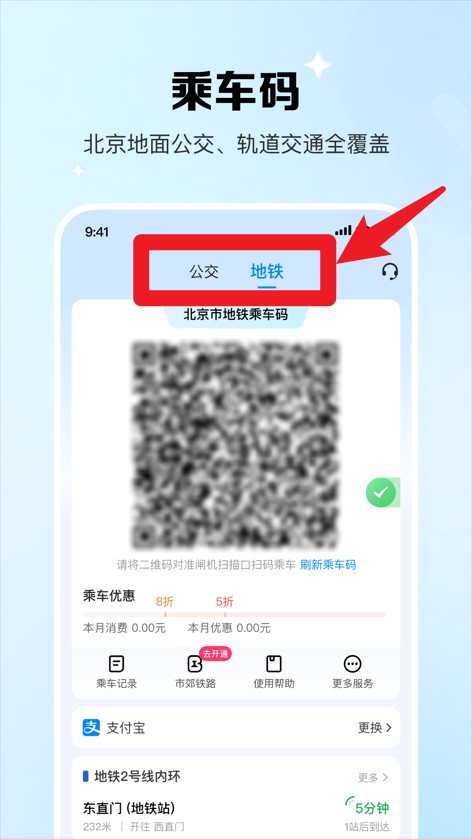 3、乘车码支持北京公交与地铁扫码乘车,页面切换便捷,二维码实时生成使用方便。