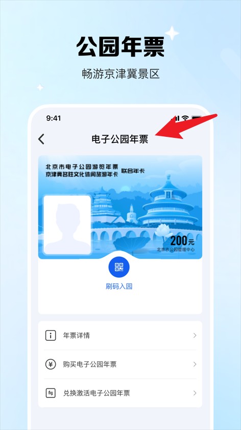 4、公园年票页面可查看票证详情,支持年票激活、购买与刷码入园,操作直观易上手。