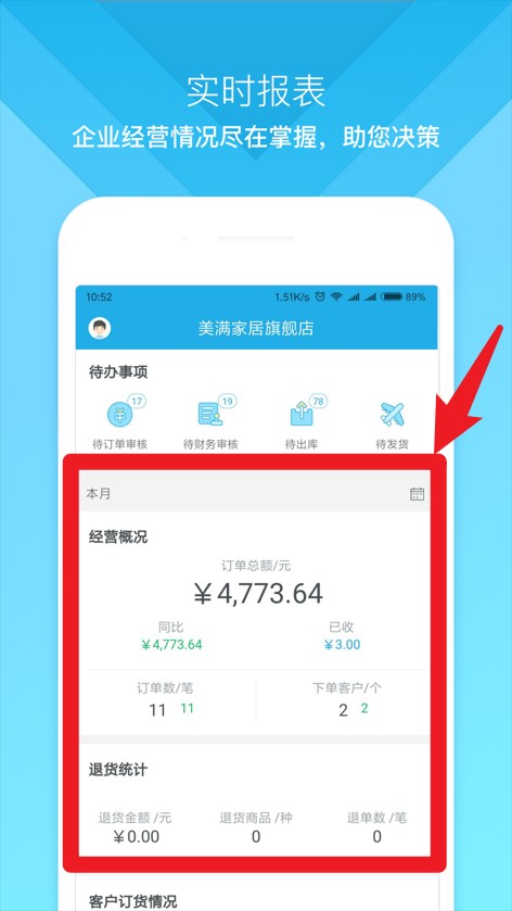 2、实时报表模块展示当前经营数据,订单金额清晰可见,帮助管理者做出精准决策。