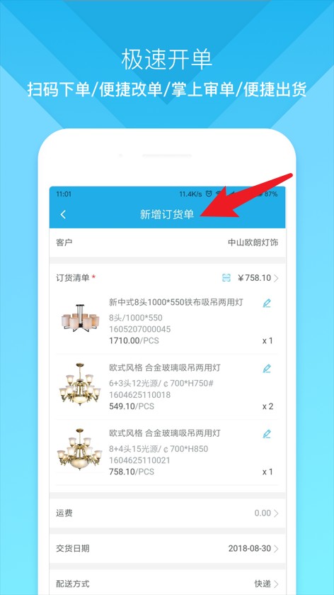 4、新增订单功能支持扫码、修改与提交,快速生成订单提升出货效率与操作便捷性。
