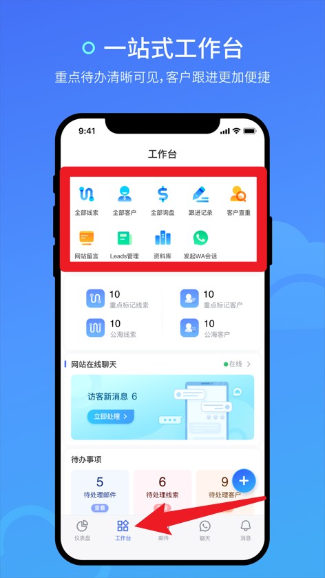 2、进入一站式工作台,集成客户管理、跟进记录、线索管理等功能,操作清晰高效。