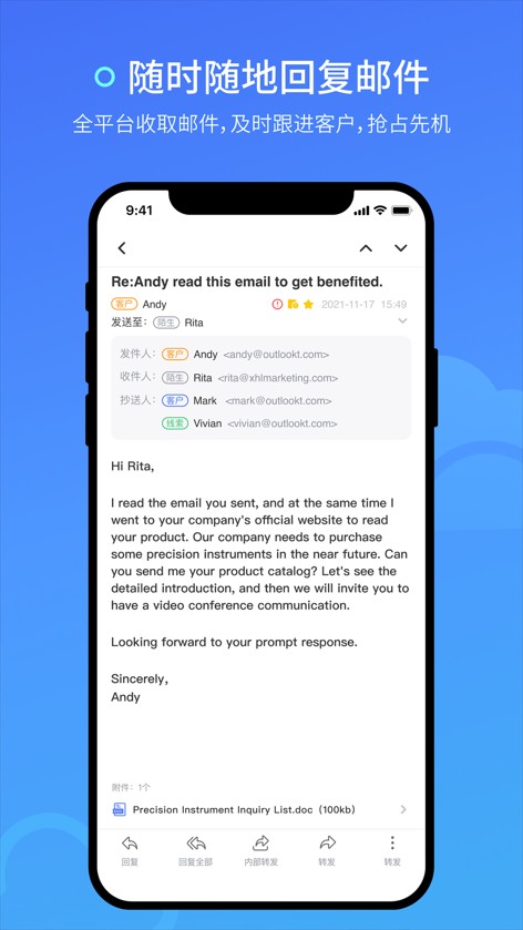 新邮件消息提醒,及时回复客户邮件,提升触达客户效率;快速识别邮件联系人的客户类型,一键查看往来邮件及附件。