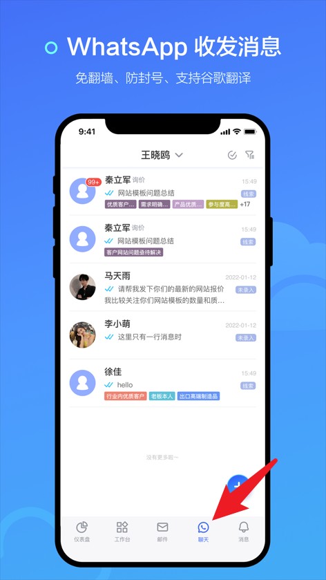 询盘云app是一款专为外贸企业打造的私域管理利器,帮你高效掌握客户旅程、轻松转化订单!集CRM、邮件、WhatsApp于一体,客户信息自动沉淀,跟进轨迹清晰可见,销售数据实时掌握。多语言翻译、异地办公无压力,封号也不怕历史消息丢失!