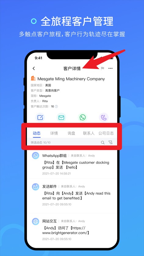 5、客户详情页面展示全流程信息,动态、日志、行为轨迹全掌握,便于精准跟进。