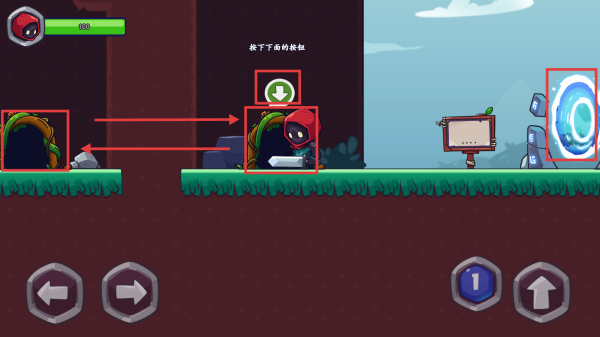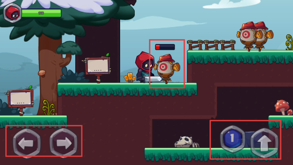 1、进入游戏,点击左右按键控制角色向左向右移动,点击向上按键可以跳跃,点击【1】进行攻击。
