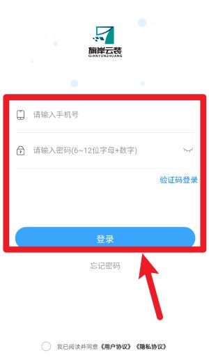 1、打开旗岸云装APP后,输入绑定的手机号码和密码,并勾选同意协议后点击下方“登录”按钮完成登录。