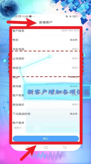 2、在“新增客户”页面中,依次填写客户姓名、性别、电话、公司名、微信号、地址等详细资料,最后点击确认完成信息录入。