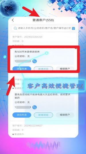 3、在普通客户页面中,可以快速查看客户历史沟通内容和项目进展,并可点击“新增项目”或“编辑客户”方便后续操作。