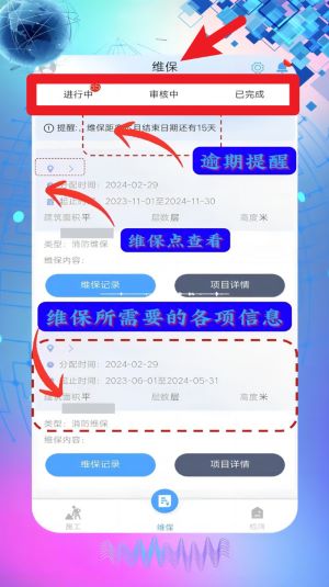 4、在维保模块中可查看进行中、审核中及已完成任务,包含提醒时间、楼层信息、维保内容等,确保维保任务清晰可见。