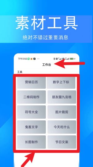 2、在素材工具页面中,可快速选择营销日历、二维码制作、朋友圈九宫格等多项实用功能进行使用。