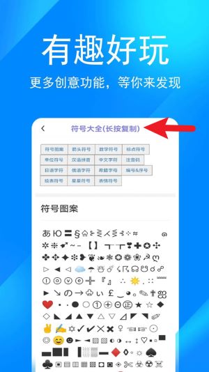3、符号大全功能中提供各种图案、单位符号、注音符号等内容,用户可长按复制用于日常编辑。