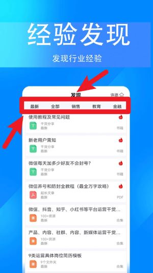 4、发现页面展示最新运营经验和行业干货资料,支持按照类别浏览学习不同领域的内容教程。