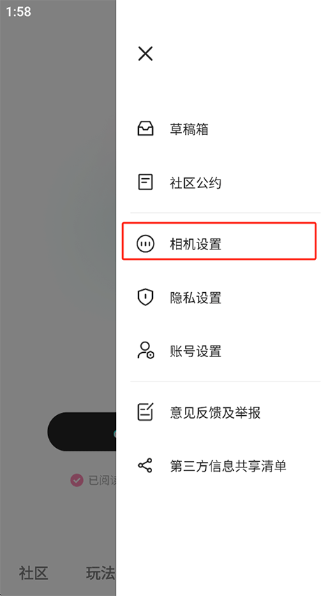 2、点击右上角的“三横线”菜单按钮,选择“相机设置”选项,进入设置页面。