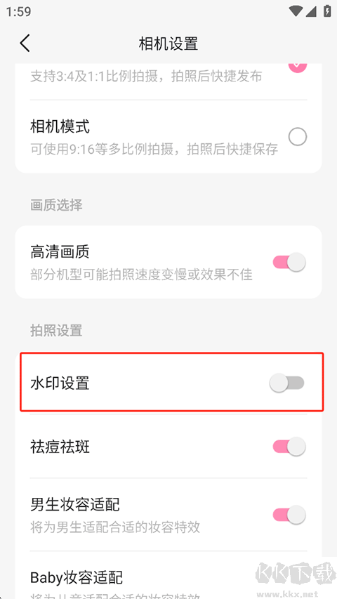 3、找到“水印设置”开关,关闭即可(部分版本显示为滑动按钮)。