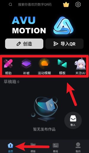 2、主页面可点击“创建”或“导入QR”,并通过下方工具栏进入帮助、补帧、运动模糊及模板编辑功能区。
