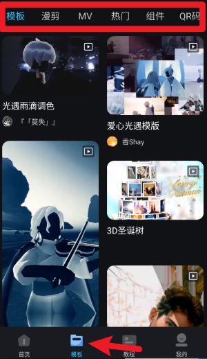 3、点击底部“模板”栏目可浏览丰富分类,包括模板、漫剪、MV、热门与组件等类型选择使用。