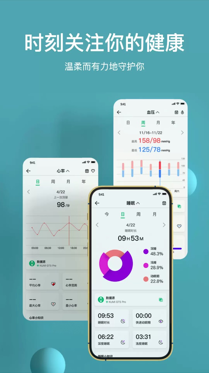 1. 实时同步手表采集的数据,支持查看心率、血压、血氧、睡眠等健康信息。