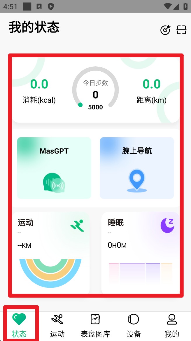 1. 在底部导航栏点击“状态”按钮,可查看当日步数、消耗热量、行走距离以及睡眠等健康数据,全面掌握身体状况。