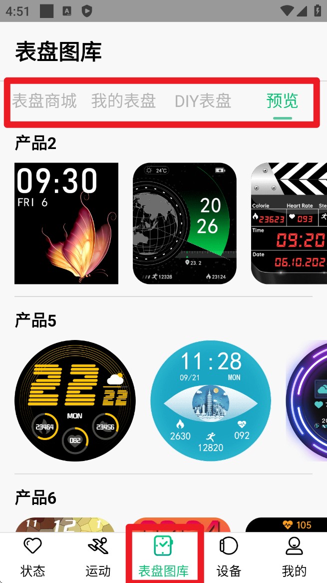 3. 进入“表盘图库”标签页,可浏览多种表盘样式,包括商店表盘、自定义表盘与我的表盘,个性化定制手表外观。