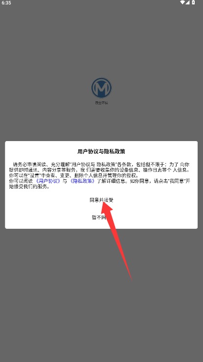 1、初次使用需阅读平台服务条款与隐私政策,确认后点击同意并接受按钮进入。