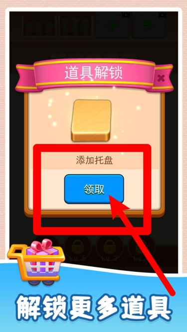 3.道具领取:出现道具解锁面板时点击领取添加托盘,拓展摆放位与操作余地,提升整理效率让挑战更轻松。