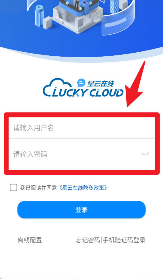 1、在登录页面输入用户名和密码完成登录,用户需同意隐私政策后才能进入系统。