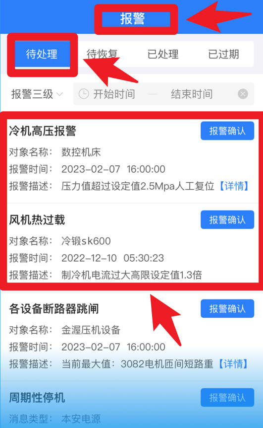 4、在报警模块,用户可以查看待处理报警详情,确保及时响应和处理异常,帮助用户高效管理。