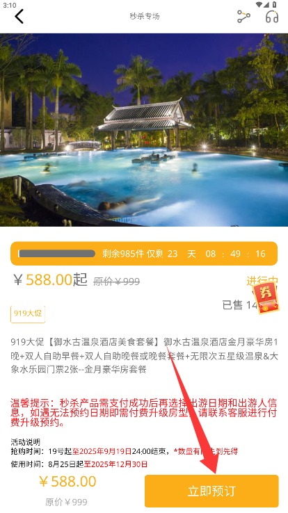 4、选择套餐查看完整详情信息后,点击立即预订按钮即可开始安排旅行计划流程。