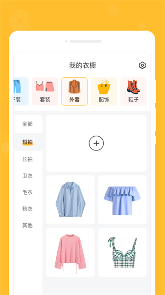 1、在【衣柜】页面,分类管理你的衣物,可以选择上装、下装、裙装等分类,方便查找与记录,保持生活有条理。