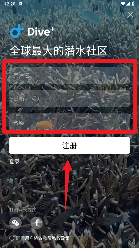 1、注册界面需要填写用户名、邮箱和密码,点击注册即可创建新账号,也可通过第三方方式快速登录,进入全球潜水社区。