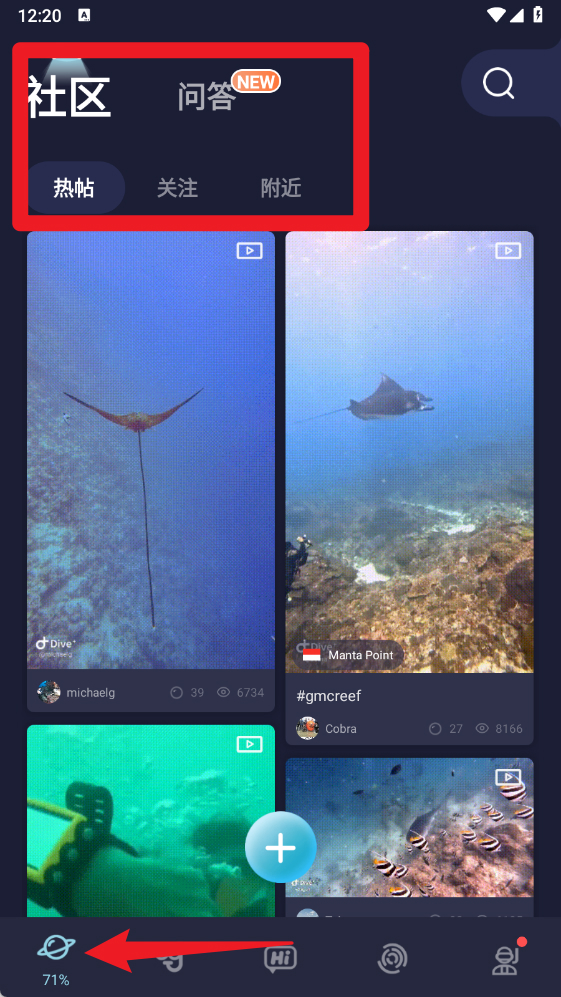2、在社区页面,用户可以浏览热门帖子、关注喜欢的内容或查看附近动态,随时参与话题互动,分享和获取潜水经验。