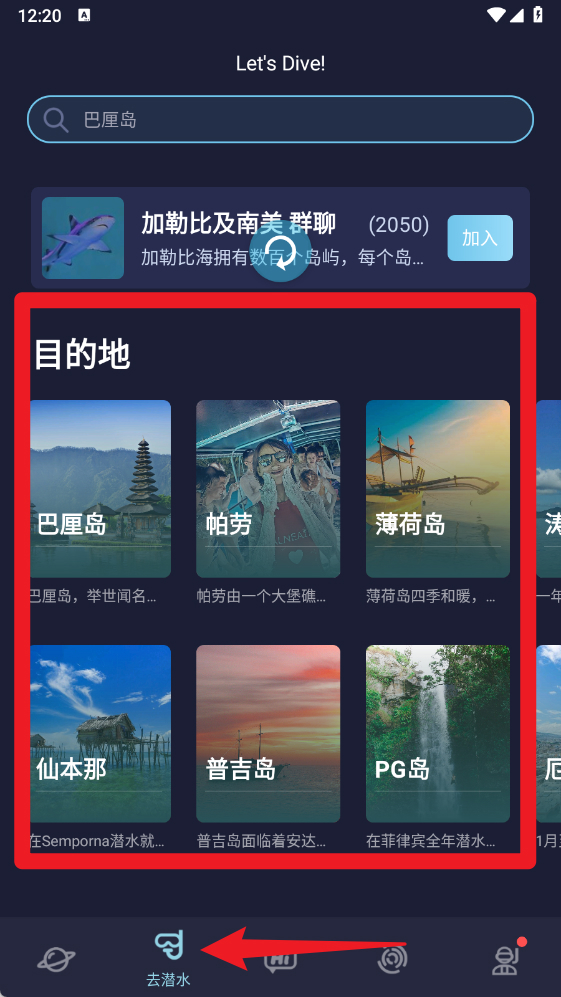 3、去潜水模块中展示了各类热门目的地,用户可选择心仪的潜点,提前了解环境特色和潜水信息,为出行做好准备。
