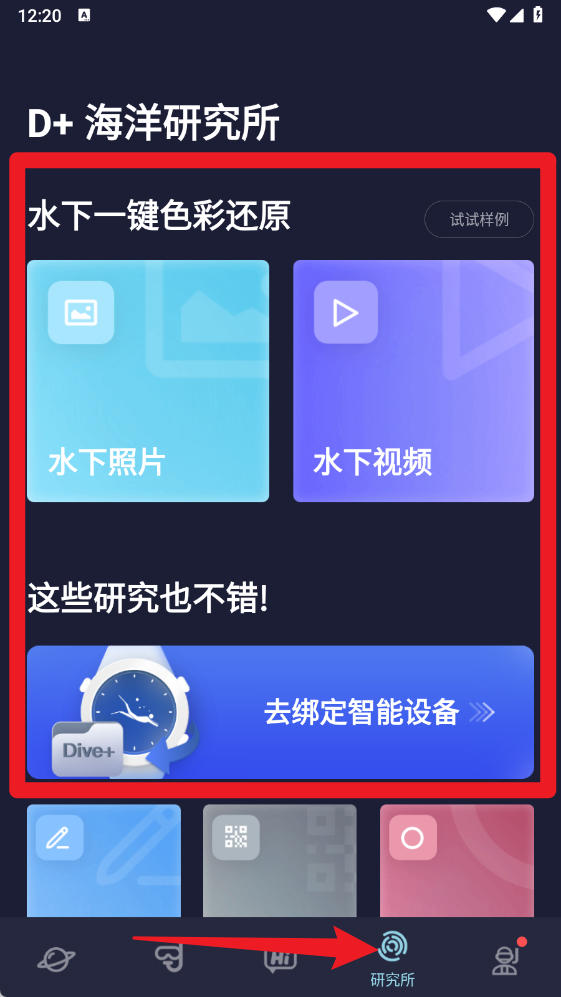 5、在海洋研究所版块,用户能使用一键还原功能优化水下照片和视频效果,还能绑定智能设备,全面提升潜水体验。