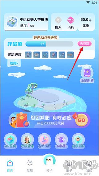2、每日进行记饮食、记运动、记体重打卡即可获取呼啦值;