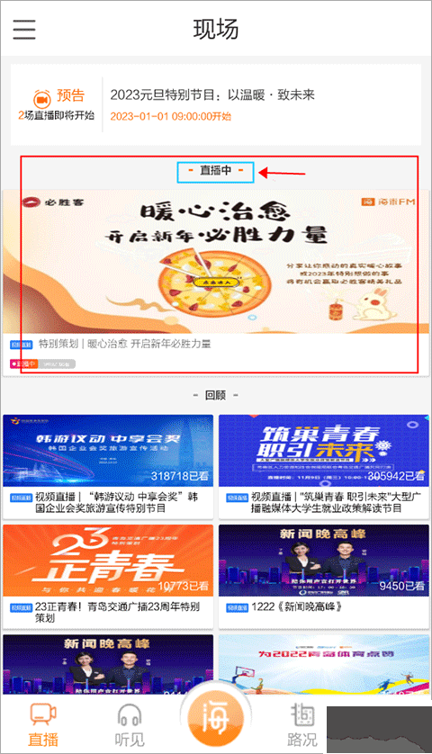 1、首先我们打开海米FM app,点击“直播”界面,可以看到在上方有一个【直播中】版块,在这里就可以看见当前时间正在直播的节目。