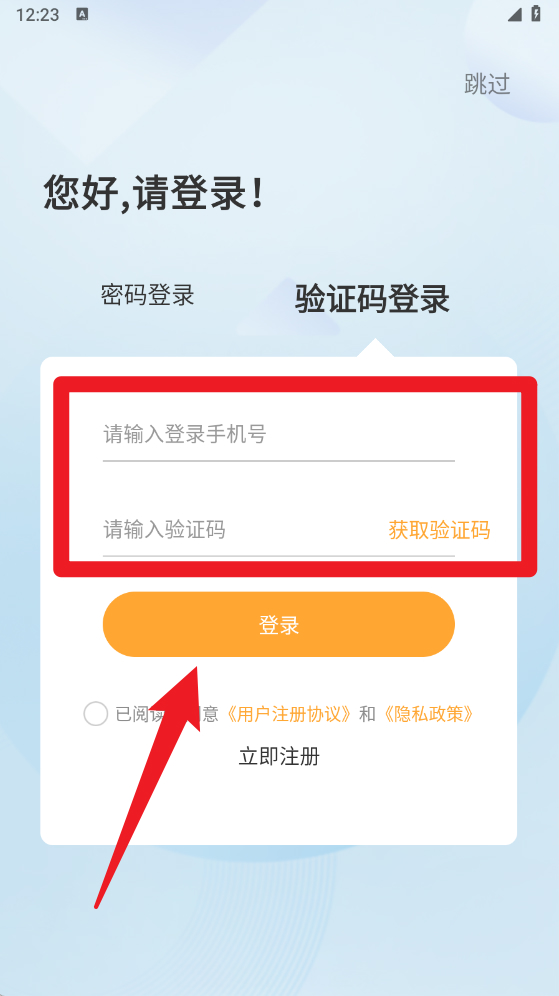 2、在【验证码登录】页面中,只需输入手机号并获取验证码,填写后点击登录,快速完成账号登录操作。