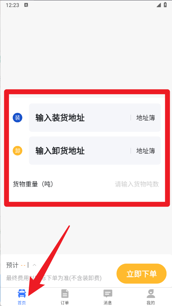 3、在【首页】中,用户需要输入装货地址、卸货地址和货物重量,填写完成后可立即下单,快速启动运输服务。
