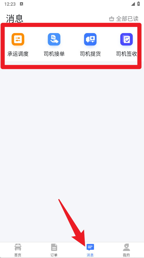 4、在【消息】页面,用户可以查看承运调度、司机接单、司机提货以及司机签收等信息,实时掌握物流运输动态。