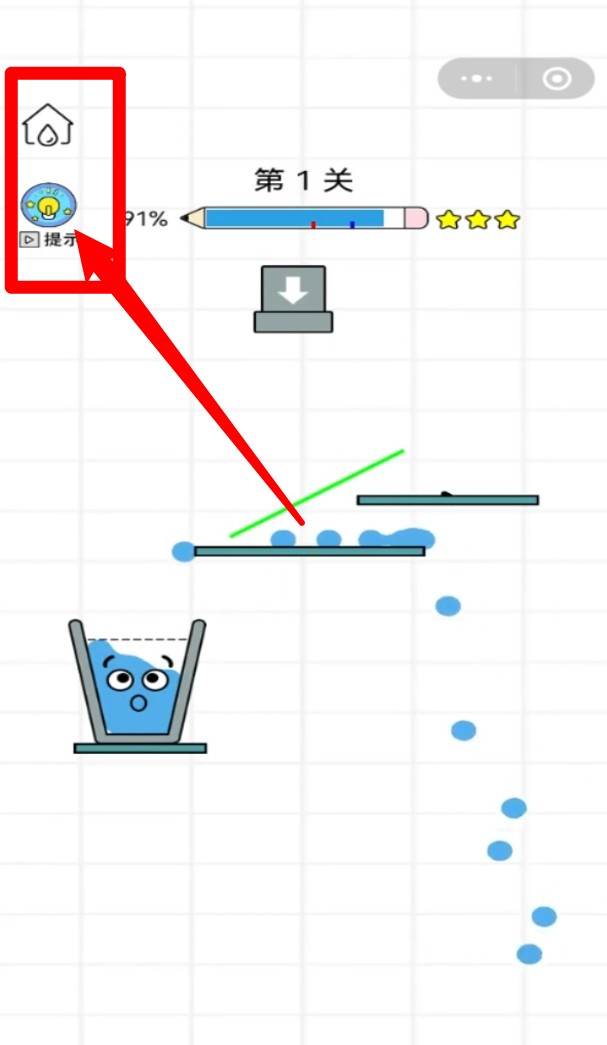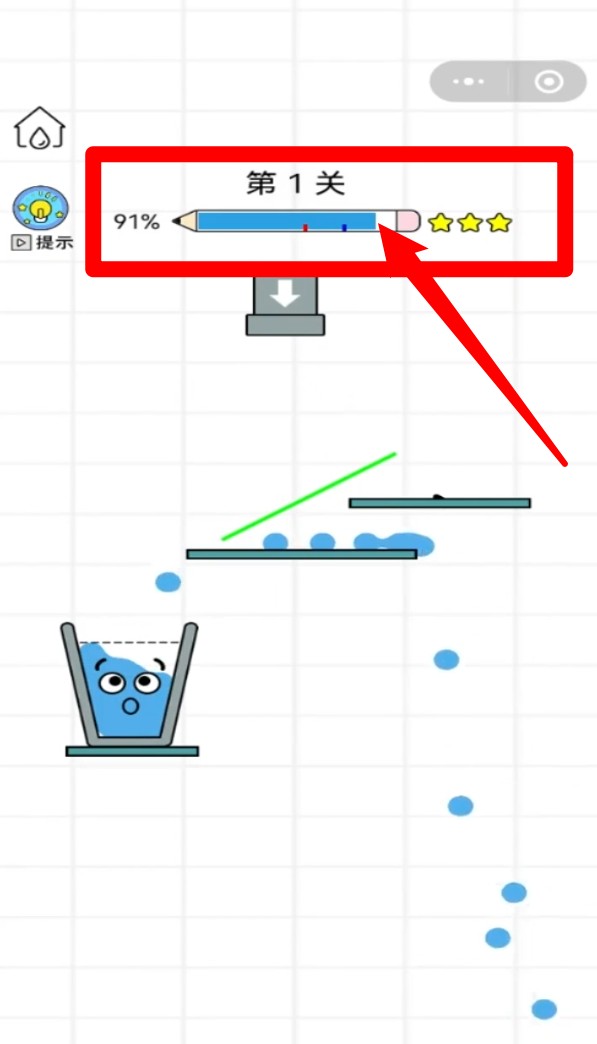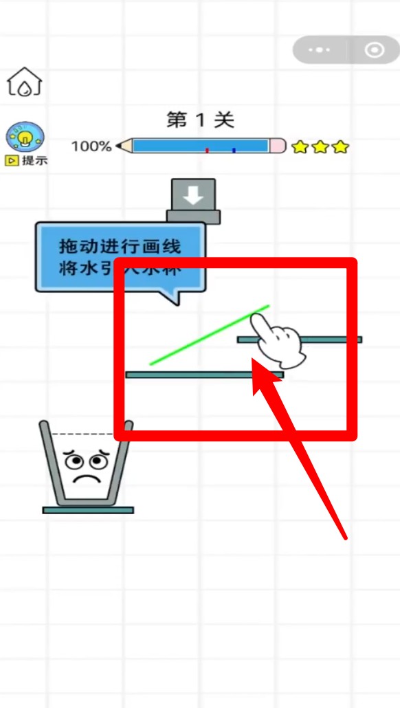 3.拖动画线引导水流顺利进入玻璃杯,让杯子装满后开心起来,成功通关关卡。